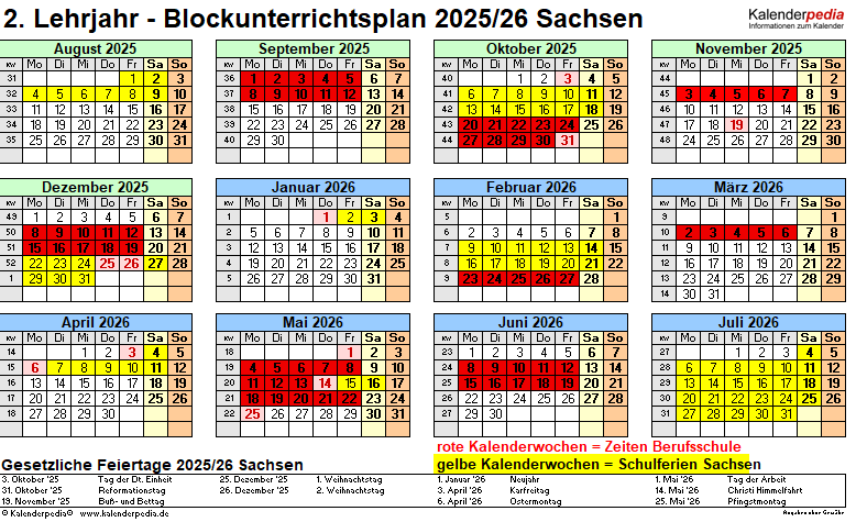 Im aktuellen Blockplan der Bauwirtschaft sind die Wochen, in denen die Ausbildung in der Berufsschule stattfindet, rot eingetragen.