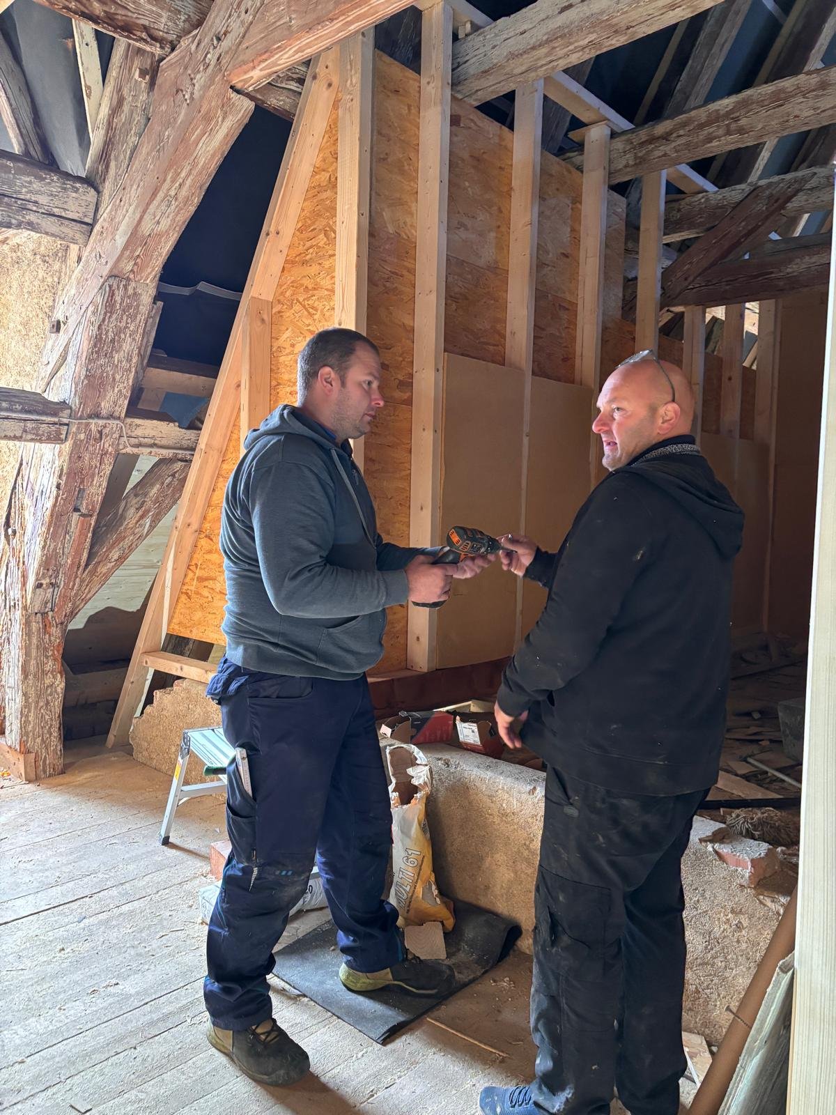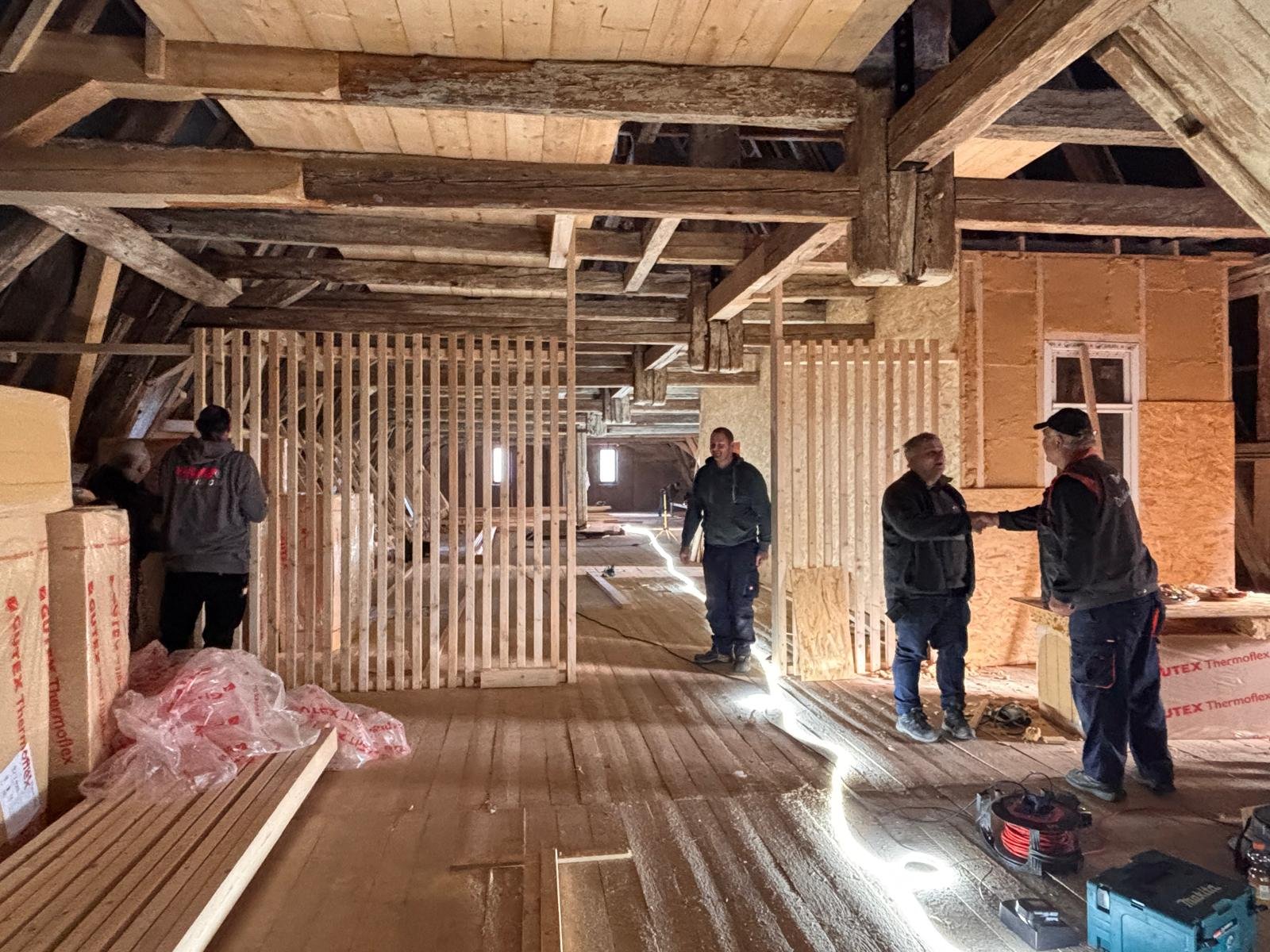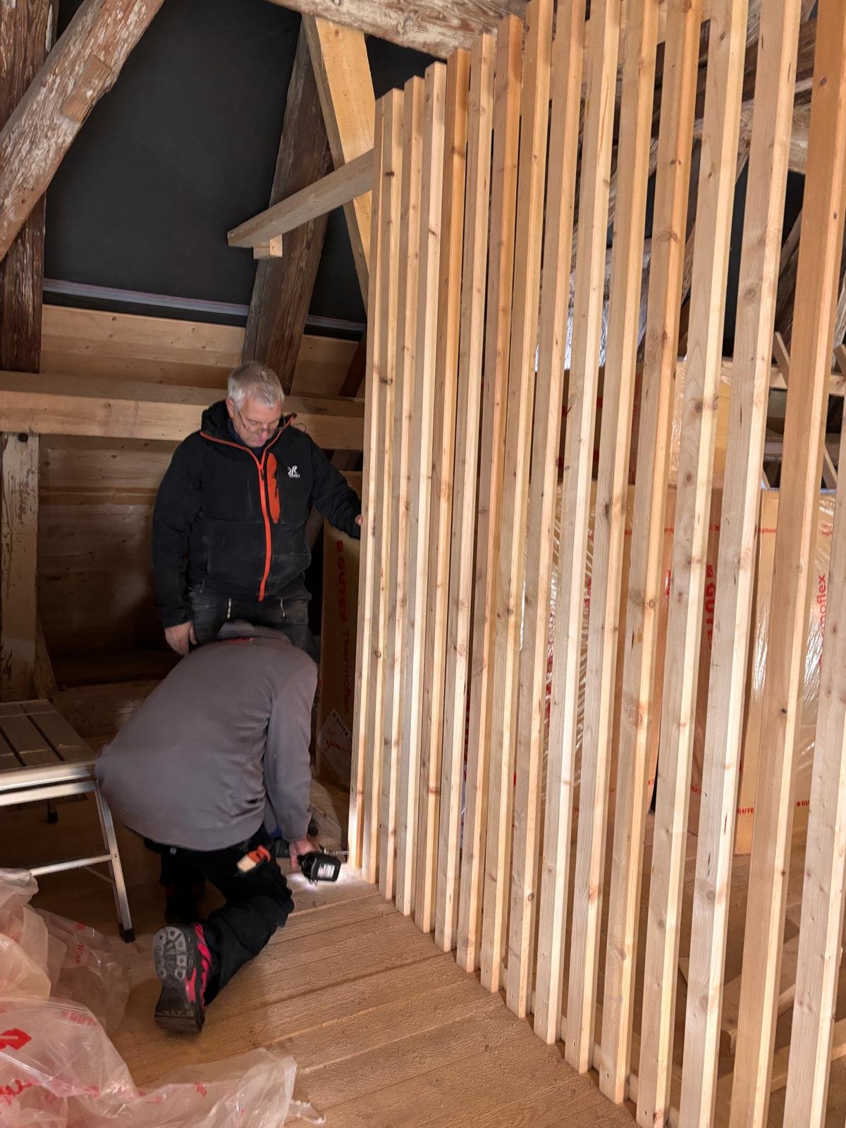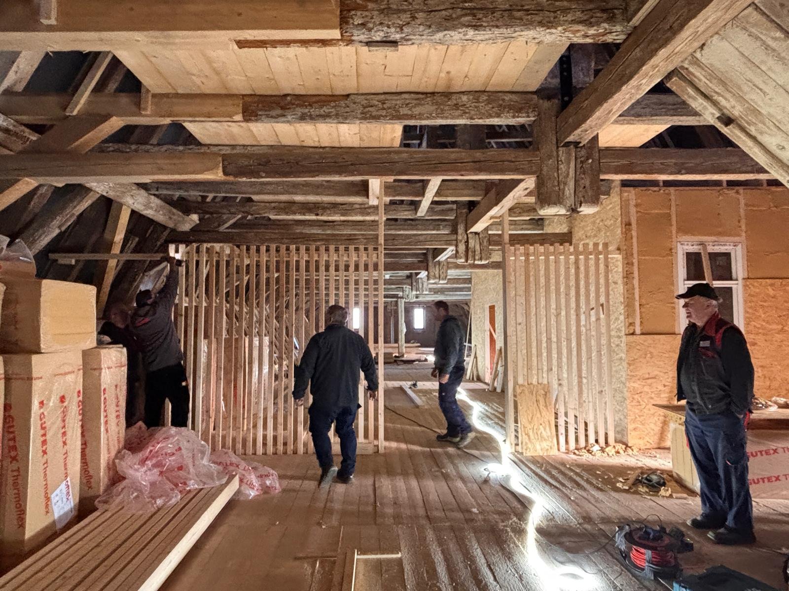 Was anfänglich bis zum Start sehr lange gedauert hat geht nun um so schneller voran. Wie in der Ausgabe vom November 2025 angekündigt, wollen wir euch hier weiter über die Arbeiten der Dachdeckerinnung Meißen-Riesa-Großenhain an der Dachziegelausstellung auf dem Kornhaus in Meissen auf dem Laufenden halten. Die Mitglieder der Dachdeckerinnung haben seit dem November kräftig losgelegt und bis heut über 600 Arbeitsstunden in das Museum gesteckt. Zwischenzeitlich wurde der größte Teil der Modelle fertig gestellt und auch zum größten Teil mit den Ausstellungsstücken behangen. Das Büro wurde soweit fertig gestellt, dass es abschließbar und beheizbar ist. Die Elektroinstallation im Büro wurde installiert und der Ausstellungsbereich mit einer Trennwand vom restl. Dachboden abgetrennt. Hier gilt ein ganz besonderer Dank den sehr engagierten Firmen unserer Innung und natürlich auch unseren Altmeistern.