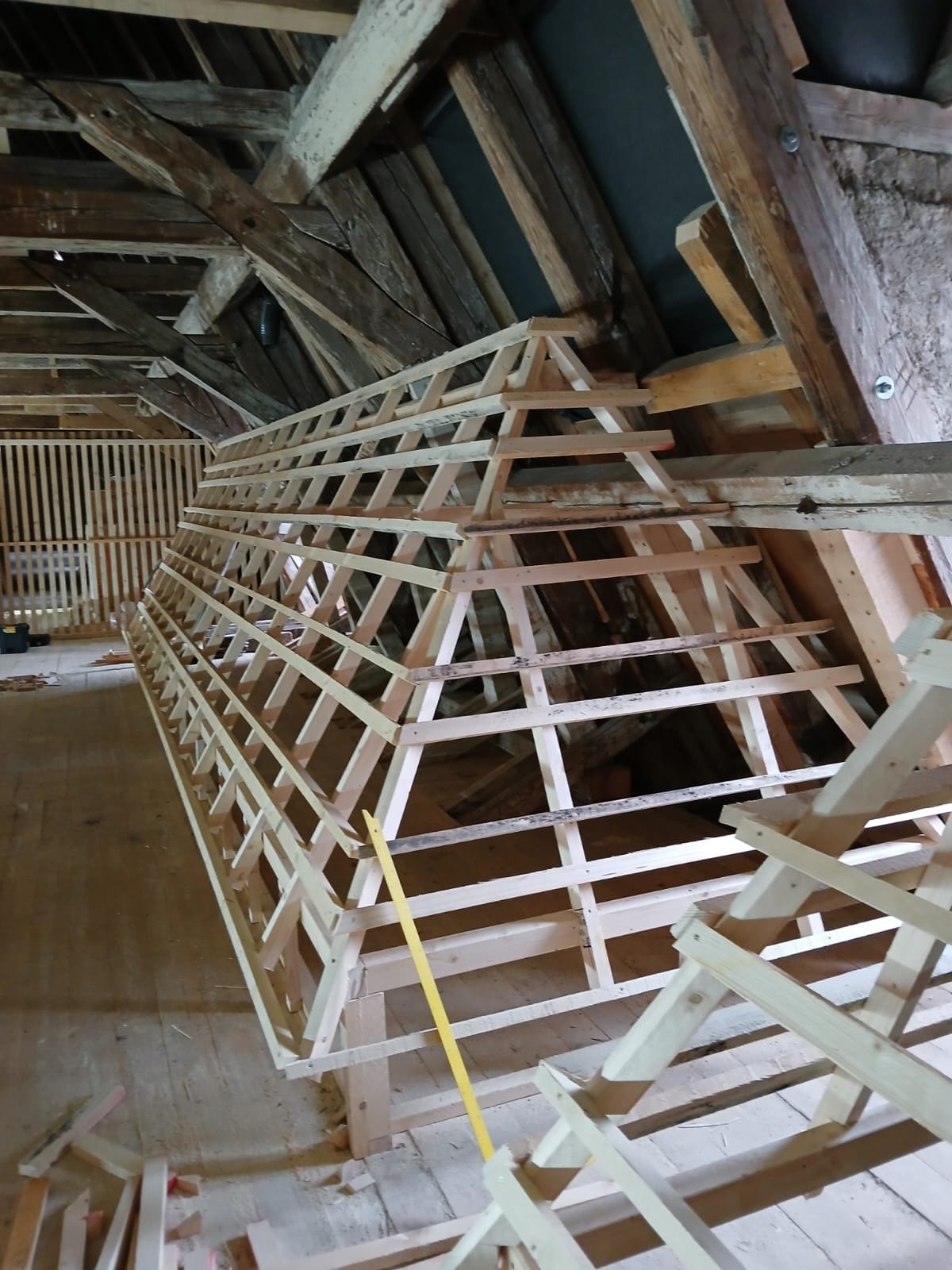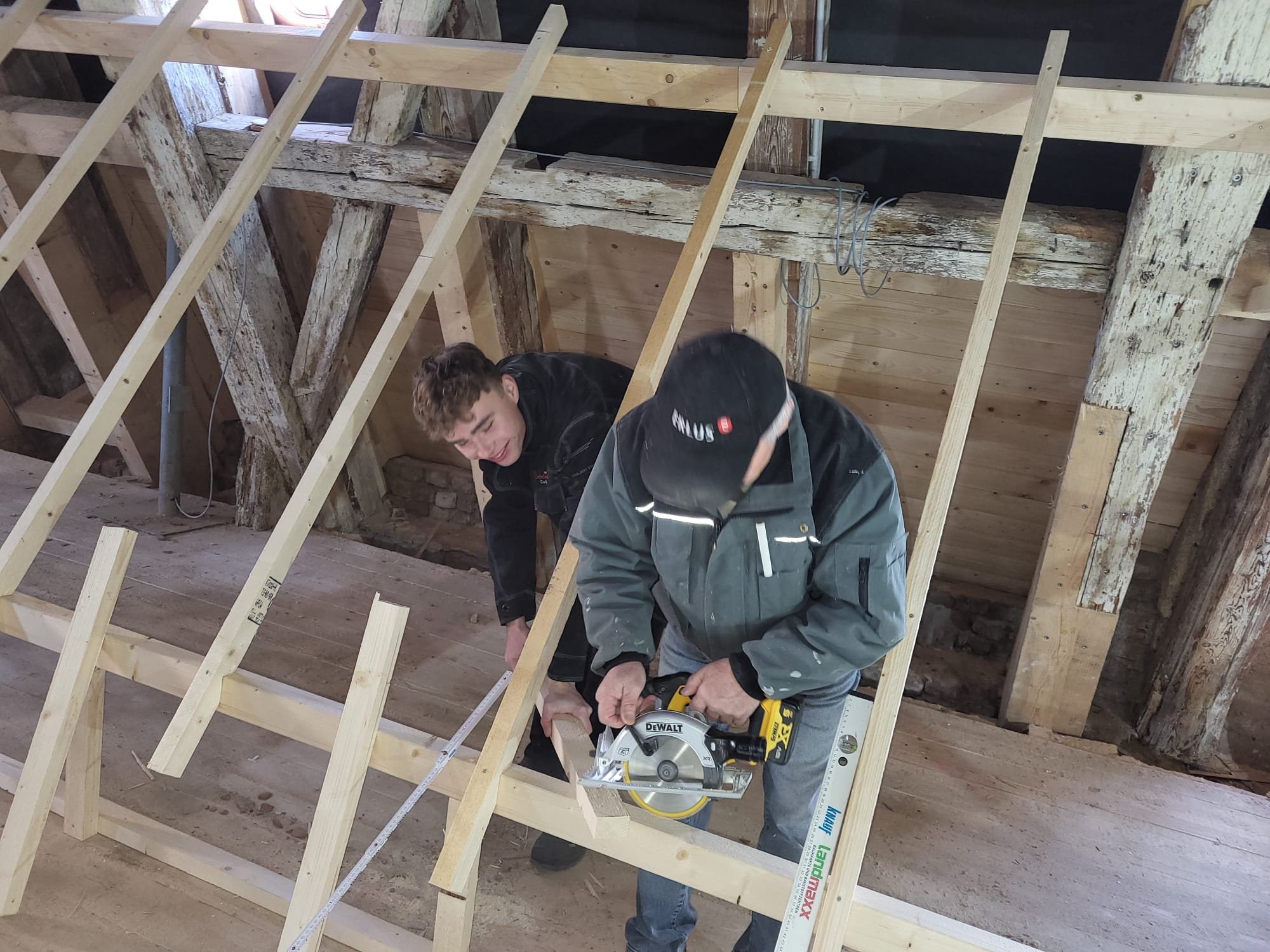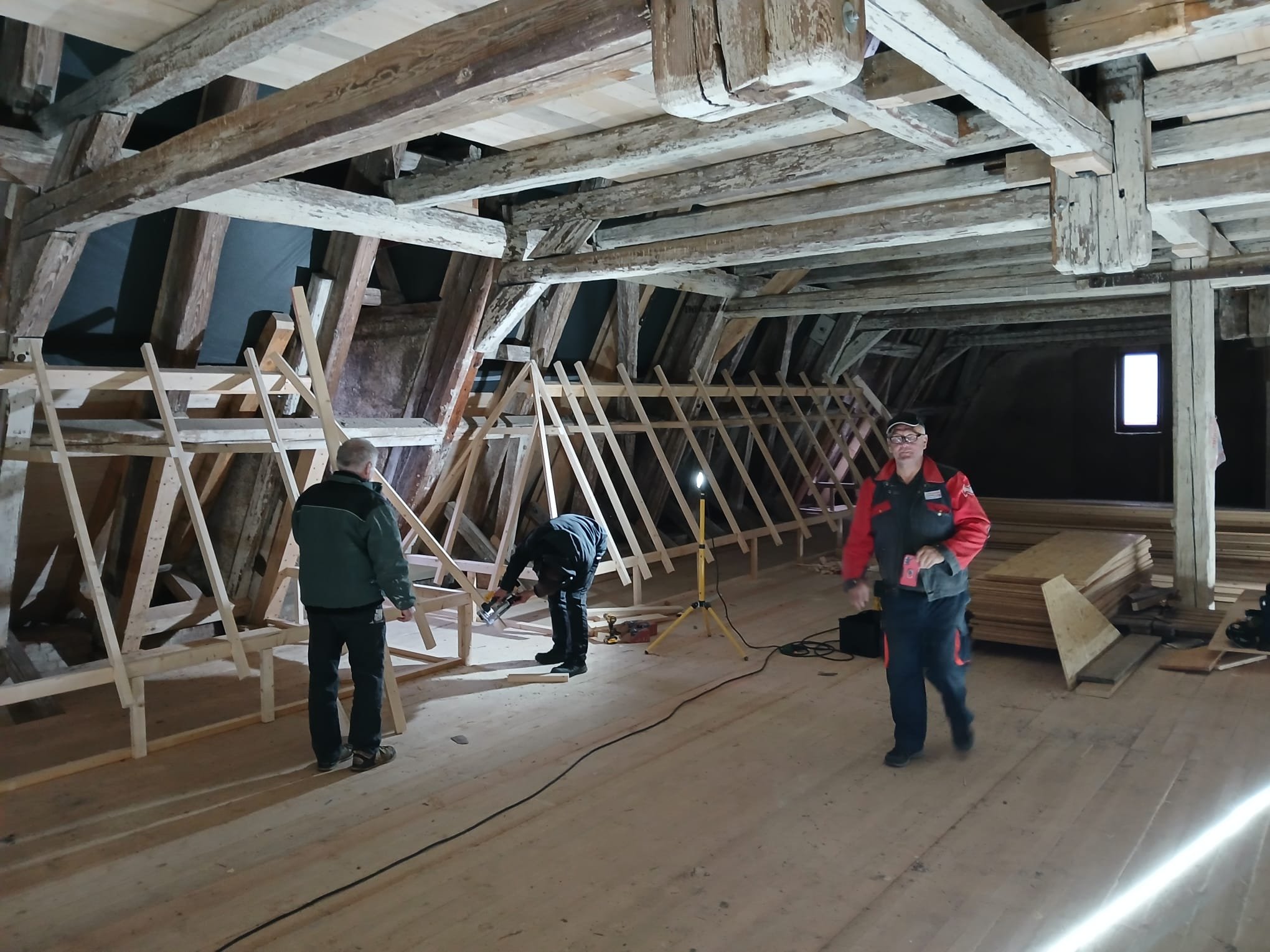 Was anfänglich bis zum Start sehr lange gedauert hat geht nun um so schneller voran. Wie in der Ausgabe vom November 2025 angekündigt, wollen wir euch hier weiter über die Arbeiten der Dachdeckerinnung Meißen-Riesa-Großenhain an der Dachziegelausstellung auf dem Kornhaus in Meissen auf dem Laufenden halten. Die Mitglieder der Dachdeckerinnung haben seit dem November kräftig losgelegt und bis heut über 600 Arbeitsstunden in das Museum gesteckt. Zwischenzeitlich wurde der größte Teil der Modelle fertig gestellt und auch zum größten Teil mit den Ausstellungsstücken behangen. Das Büro wurde soweit fertig gestellt, dass es abschließbar und beheizbar ist. Die Elektroinstallation im Büro wurde installiert und der Ausstellungsbereich mit einer Trennwand vom restl. Dachboden abgetrennt. Hier gilt ein ganz besonderer Dank den sehr engagierten Firmen unserer Innung und natürlich auch unseren Altmeistern.
